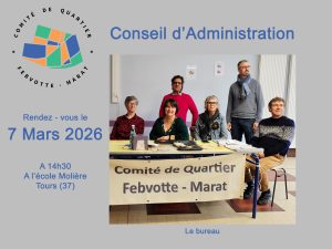 Samedi 7 mars à partir de 14h30 à l’école Molière (37000 Tours), nous vous attendons pour notre Assemblée Générale. Nous avons à l’ordre du jour : Une présentation de la Manufacture Tourangelle, et à 15h00 la présentation et le vote du rapport moral et financier du Comité de Quartier pour 2025. Présentation des perspectives 2026.
